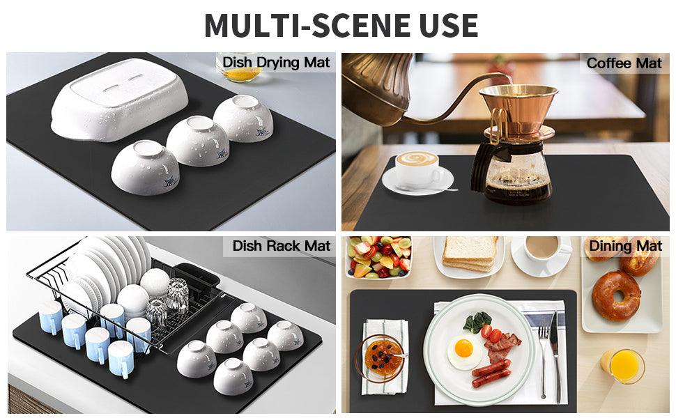 [Non-slip and Durable]: The rubber bottom of the drying mat for kitchen counter has a good anti-slip and anti-scratch effect. Holds dishes, coffee maker or any other item in place and prevents water from seeping onto countertops. The dish drying mat is tear and abrasion resistant, can be reused many times